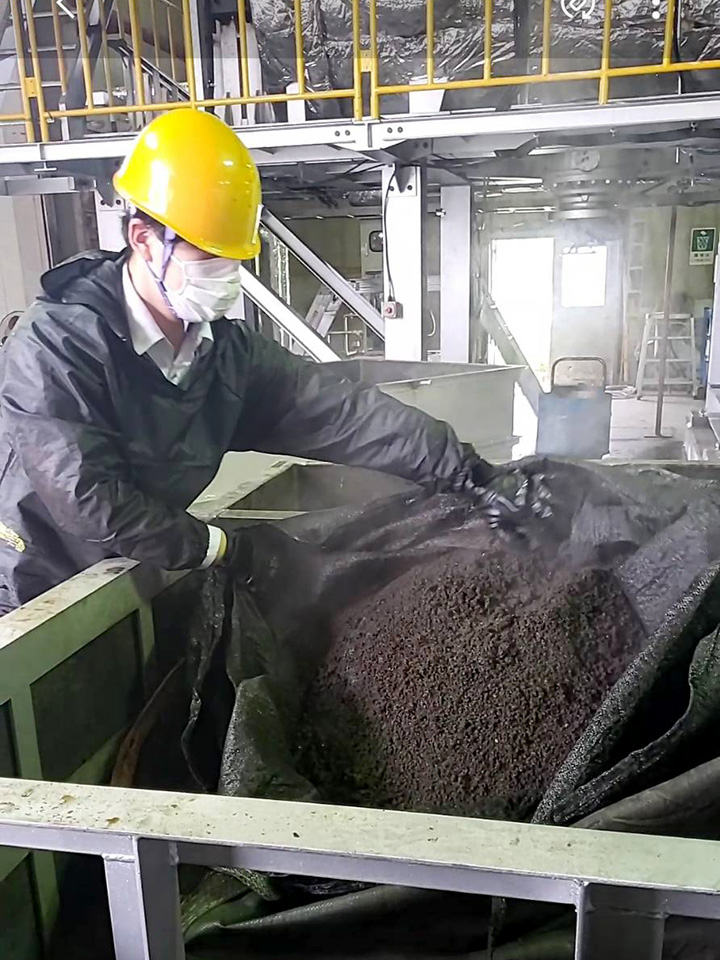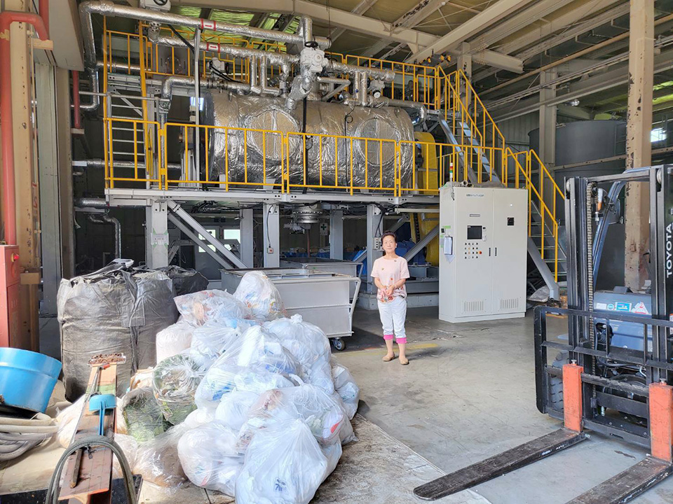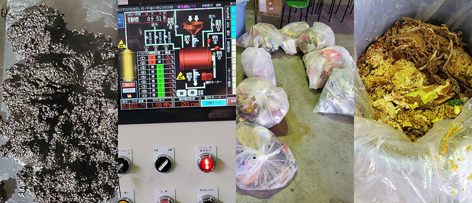 生ゴミや廃プラスチックといった都市ゴミをトラックで持ち込み、高温高圧水解処理装置で分解処理します。無菌状態で処理されたゴミは外に置くことにより、7日くらいで空気中の箘がつき、有機肥料となります。帰りのトラックは生成された堆肥を満載して帰ります。それを堆肥として販売します。
